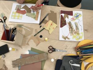 Les artistes du jour ont commencé par créer des textures par frottage, suivie d’une séance de découpage de formes dans ces textures et selon des patrons. Après les avoir collées, elles ont reliés les différentes formes par des traits