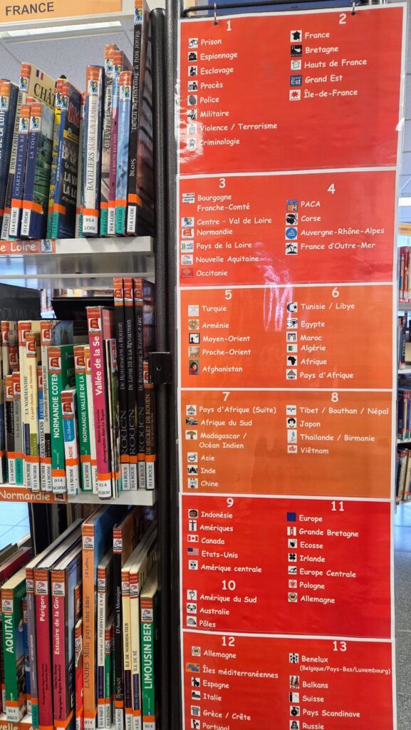 La médiathèque compte 6 pôles documentaires : Sciences / Penser le monde / Récits de vie / Arts et spectacles / Des pays et des hommes / Sports et loisirs.